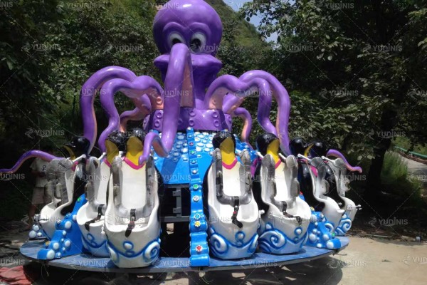 Para parques que buscan cubrir un público más joven, nuestra fábrica ofrece el octopus turntable ride, un equipo tipo wipeout con diseño de pulpo. Tiene capacidad para 16 personas, ocupa un área de 8 × 8 metros, funciona con 380V, cuenta con una potencia de 7 kW y una altura de elevación de 1,5 metros. Su intensidad es más suave, lo que lo hace ideal para niños y familias, y funciona como complemento estratégico al Trabant dentro de una misma zona de atracciones. Además, si buscas un equipo familiar giratorio de gran tamaño con diseño de pulpo, también ofrecemos un juego mecánico giratorio de pulpo de 40 plazas, perfecta para parques con mayor afluencia y necesidades de capacidad.
